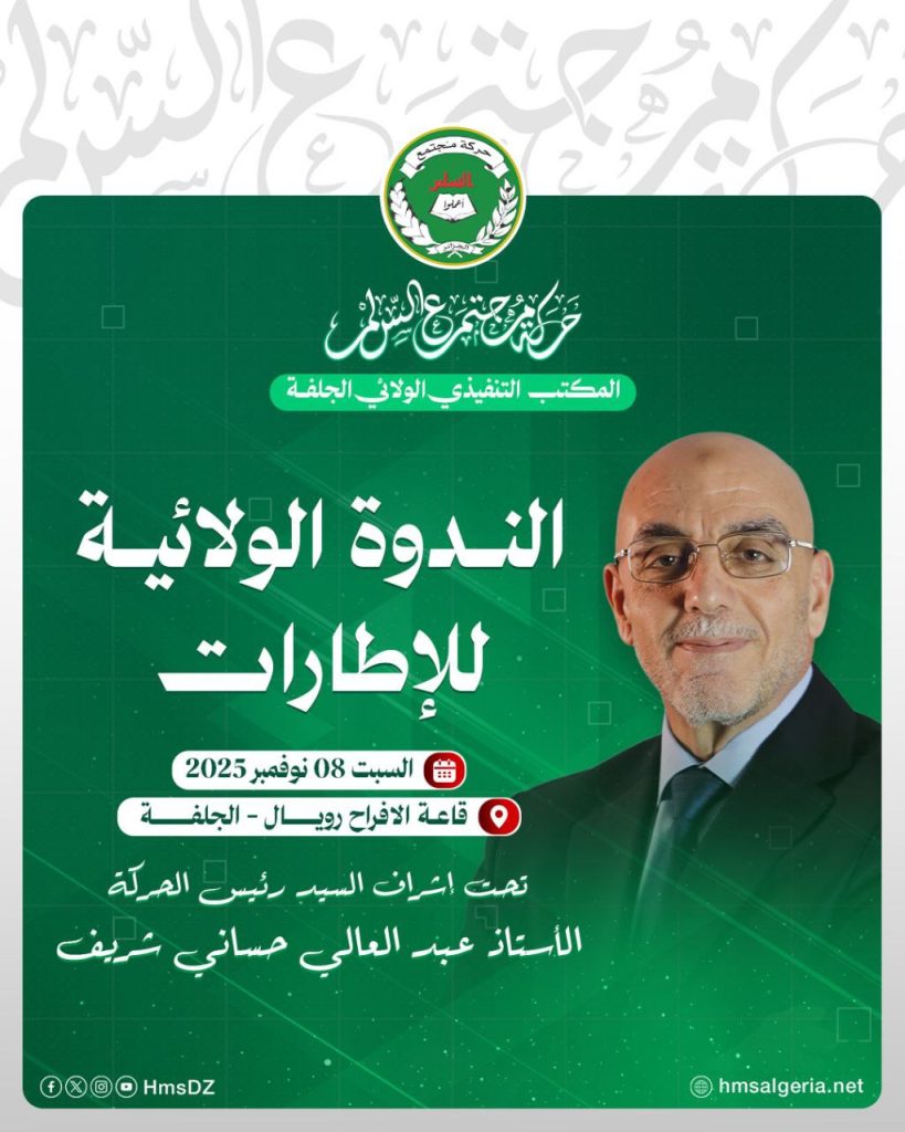 يُشارك رئيس حركة مجتمع السلم، أ. عبد العالي حساني شريف، غدًا السبت 08 نوفمبر 2025 في ولاية الجلفة للإشراف على الندوة الولائية للإطارات، والتي تهدف إلى تعزيز دور الهياكل التنظيمية للحركة على المستوى المحلي وتبادل الرؤى حول برامج العمل المستقبلي.