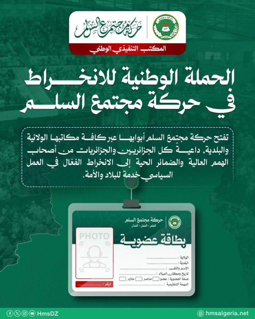 تفتح حركة مجتمع السلم أبوابها عبر كافة مكاتبها البلدية والولائية، داعية كل الجزائريين والجزائريات من أصحاب الهمم العالية والضمائر الحية إلى الانخراط الفعال في العمل السياسي خدمةً للبلاد والأمة.