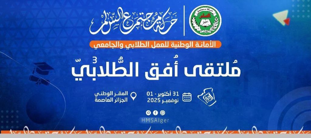 تنظم الأمانة الوطنية للعمل الطلّابي والجامعي لحركة مجتمع السلم ملتقى أُفُق الطّلّابي 03، يومي 31 أكتوبر و1 نوفمبر 2025، بالمقر الوطني في الجزائر العاصمة.